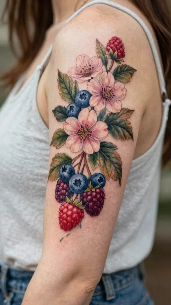 Berry blossoms, such as raspberry and blueberry flowers, create a unique and charming tattoo sleeve. These blossoms often symbolize love and affection, making them a sweet choice for personal expression.