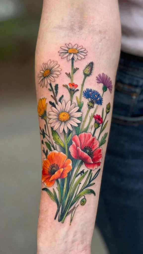 If you’re drawn to a free-spirited vibe, whimsical wildflower tattoos might just be your perfect match. With a delightful mix of flowers like daisies and poppies, this design embodies creativity and joy. The playfulness of wildflowers often creates a stunning tapestry that flows gracefully around your arm, making it a lovely choice for those who embrace nature’s beauty.