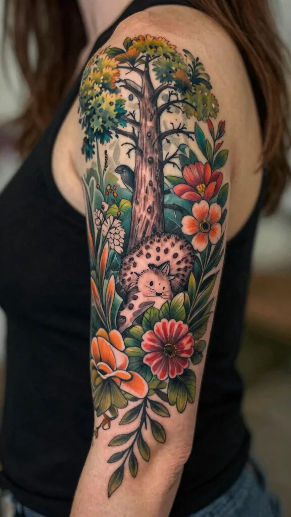 Nature’s embrace tattoo sleeves combine various floral and natural elements in a cohesive design that represents life’s interconnectedness. This sleeve can feature trees, flowers, and even animals, creating a harmonious blend of nature’s beauty.
