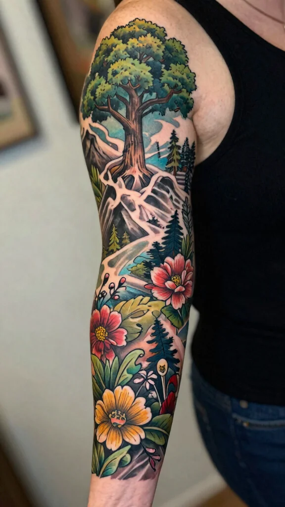 Celebrate the beauty of the natural world with a Nature’s Symphony tattoo sleeve, combining elements like trees, mountains, and rivers. This breathtaking design tells a story of your connection with nature, featuring a harmonious mix of colors and textures. Each element can represent personal experiences, symbolizing growth and resilience in your life.