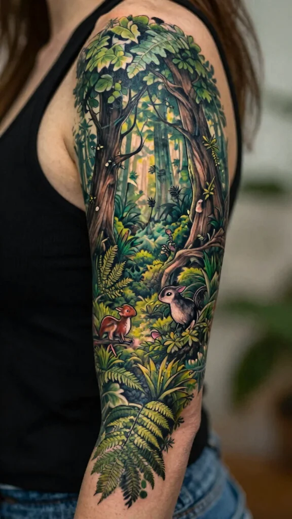 Step into a world of magic with an enchanted forest tattoo sleeve, filled with trees, ferns, and woodland creatures. This design creates a mystical atmosphere, transporting you into a serene and whimsical landscape. The interplay of light and shadow adds depth, making your arm look like a portal to an enchanting realm.