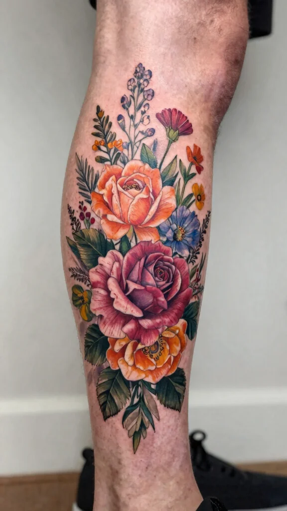 For a leg tattoo, think about a single flower on the calf for a subtle touch, or a bouquet wrapping around the thigh for a bolder statement.