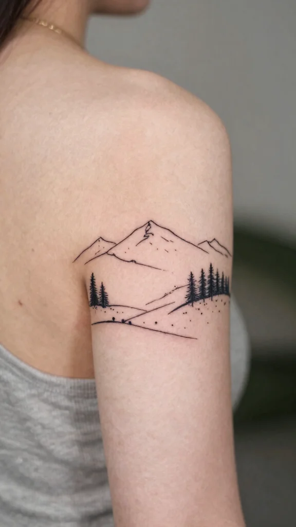 A minimalist landscape tattoo is a beautiful way to carry a piece of the world with you, reminding you of cherished memories.