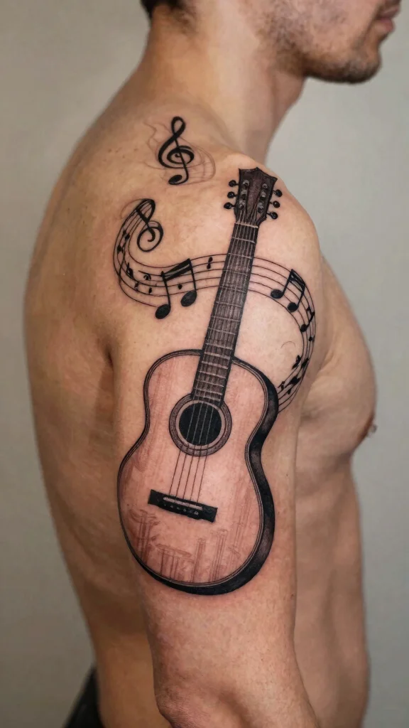 For music lovers, tattoos featuring musical notes or instruments beautifully express your passion. These designs can range from minimalist notes to elaborate depictions of guitars or pianos. A music tattoo on your back symbolizes your connection to creativity and expression.