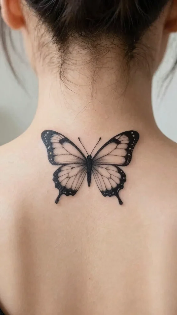 Butterflies symbolize transformation and beauty, making them a timeless tattoo choice. A small butterfly behind the neck can signify personal growth and freedom. The delicate design can be rendered with fine lines for a minimalist touch, creating a stunning visual.