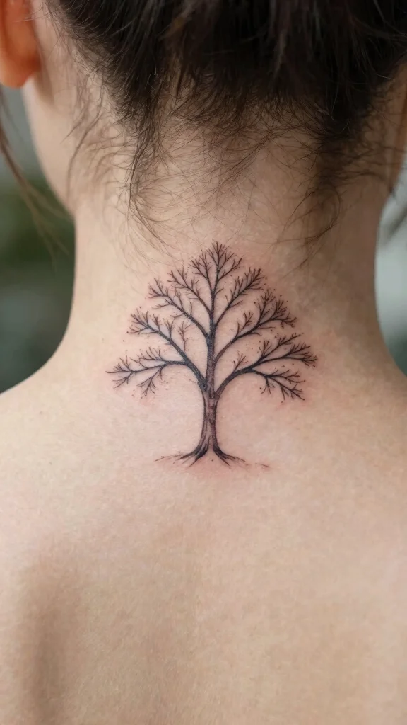 A tree tattoo symbolizes growth, strength, and family roots. Opting for a minimalist tree design, like a small sapling or a simple oak, can represent your personal journey and the importance of connections. Tree tattoos are timeless pieces that carry significant meaning, making them ideal for behind the neck.