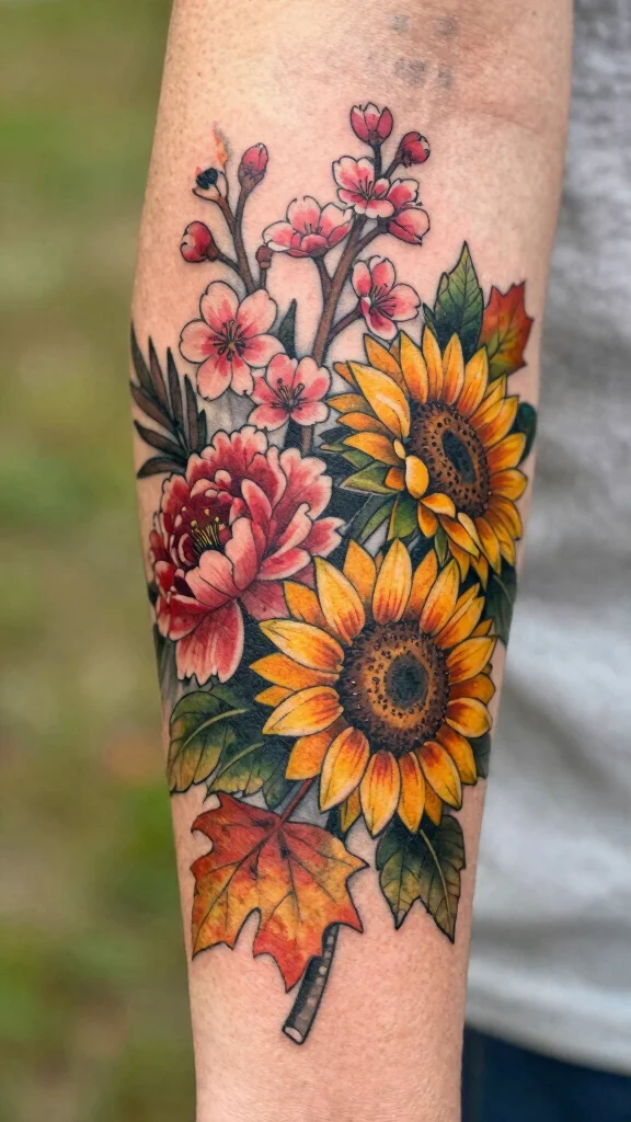 A seasonal theme adds dynamism to your ink, making it a vibrant expression of your life’s journey.