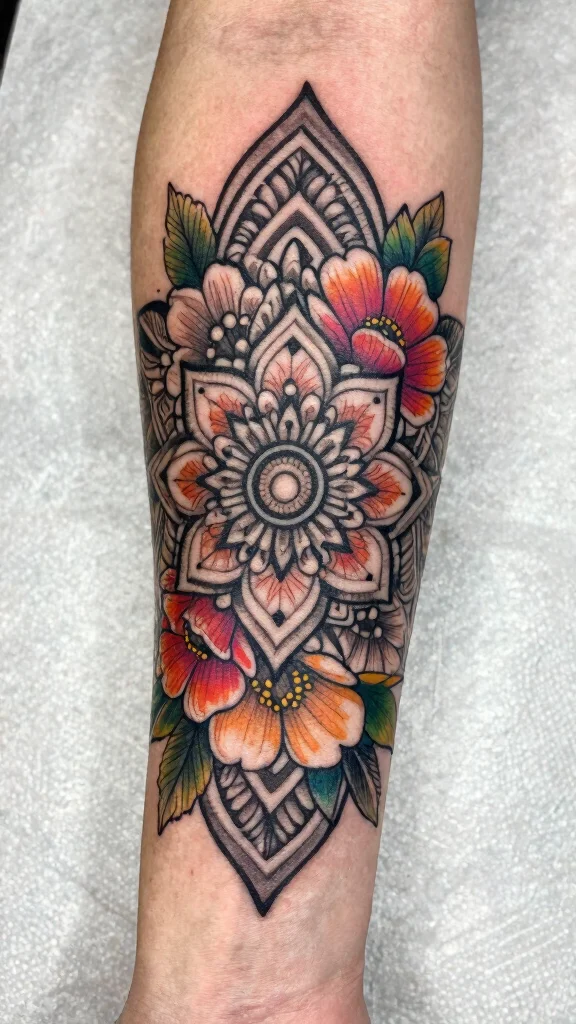 For those who appreciate both geometric design and nature, a floral mandala fusion tattoo is a stunning option. This style marries the symmetry of mandalas with the soft curves of flowers, creating a beautiful balance on your arm. The intricate mandala details symbolize unity, while the flowers add a touch of softness and femininity, making it a deeply meaningful piece.