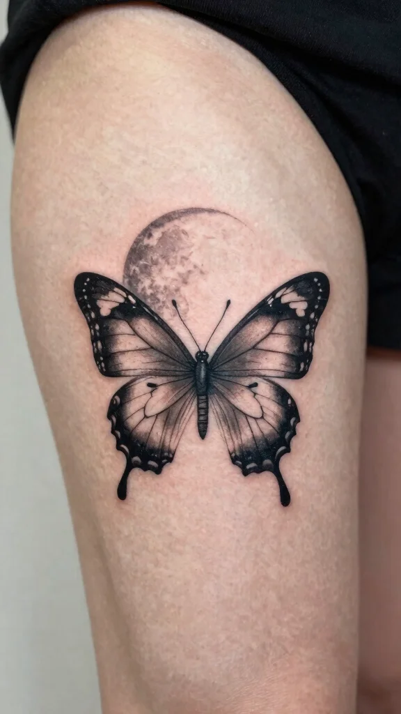 This design suits the thigh well, allowing for a larger piece that can showcase intricate details. You can depict the moon in various phases alongside the butterfly for added meaning.