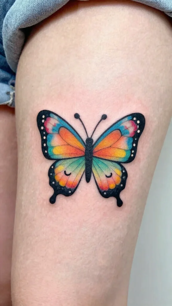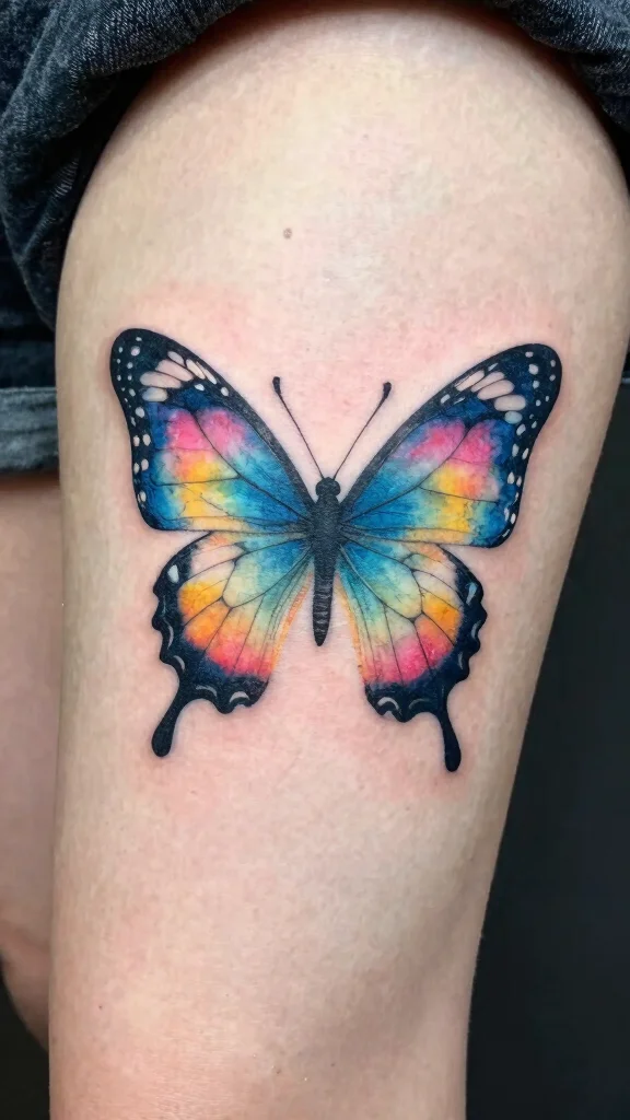 Position this design on your thigh to allow the colors to flow and meld beautifully. You might choose to depict the butterfly in mid-flight, with trailing splashes of color that enhance the sense of movement.
