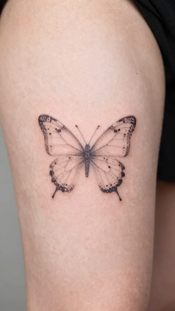 A minimalist butterfly tattoo highlighted with tiny dots presents a trendy and artistic flair. The butterfly’s outline, crafted with small dots, creates a unique texture that maintains simplicity while making a strong statement. This modern design is perfect for those who favor understated elegance in body art.