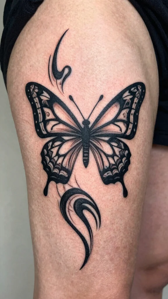 A tribal butterfly tattoo showcases intricate patterns and bold lines, connecting you to cultural roots. This striking design often features spirals and shapes that highlight the beauty of tribal artistry while expressing individuality. It’s a powerful design that conveys strength and pride.