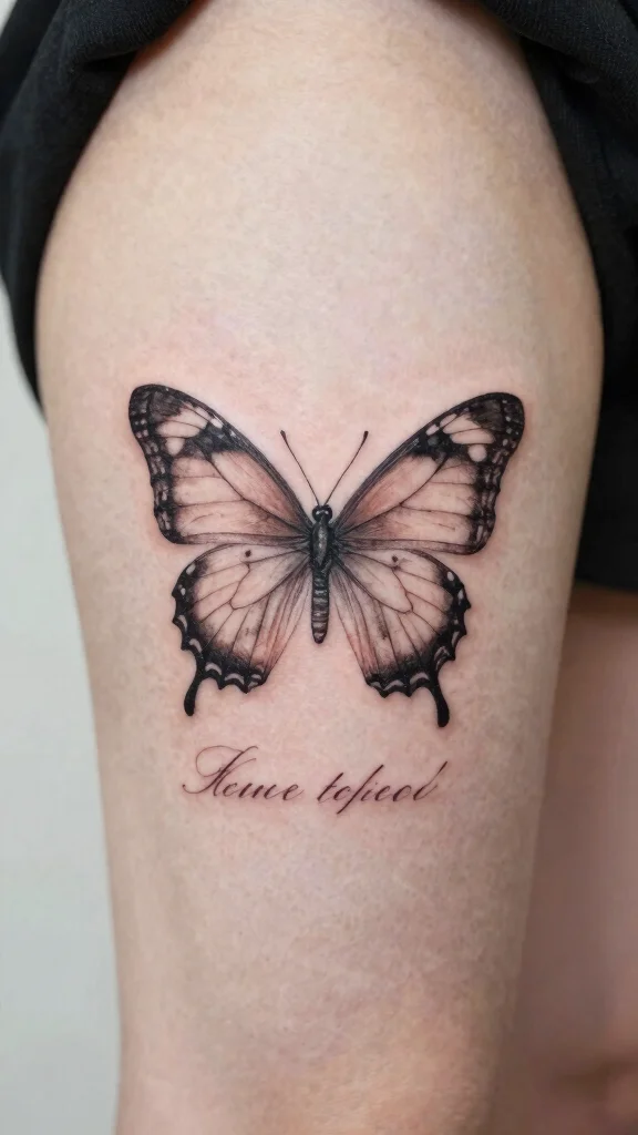 Consider placing this tattoo on your outer thigh with the butterfly above or below the text for balance. Choose a font that harmonizes with the butterfly design—playful for whimsical styles or graceful for elegant artworks.